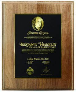 Known as the Benjamin Franklin Award of Distinction, it can be presented to any lodge in the NMJ to recognize 50 years of service and 25-year increments thereafter. The plaque has a raised design and features the image of Brother Benjamin Franklin, the double-headed eagle of the Scottish Rite, the square and compasses, and the following quote in brass lettering: